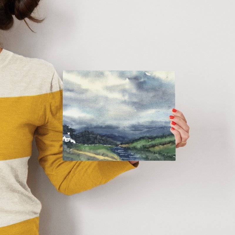 This watercolour is part of my "Cloud Symphony" series painted in Ireland. The beautiful Irish landscape provides endless inspiration. The artist is especially drawn to the way land, sea and sky play together, changing from soft to wild within minutes.