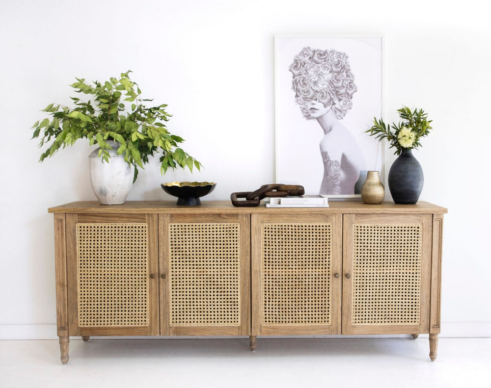 The Coralie Sideboard is a statement of natural elegance, crafted from sustainably sourced white cedar and finished in a smooth, weathered oak finish. Its presence is both grounded and graceful — solid in structure yet softened by the airy beauty of handwoven rattan cane inserts. The four doors open to reveal generous shelving, perfect for storing everyday essentials, while the intricate cane panels invite light and texture into your space.