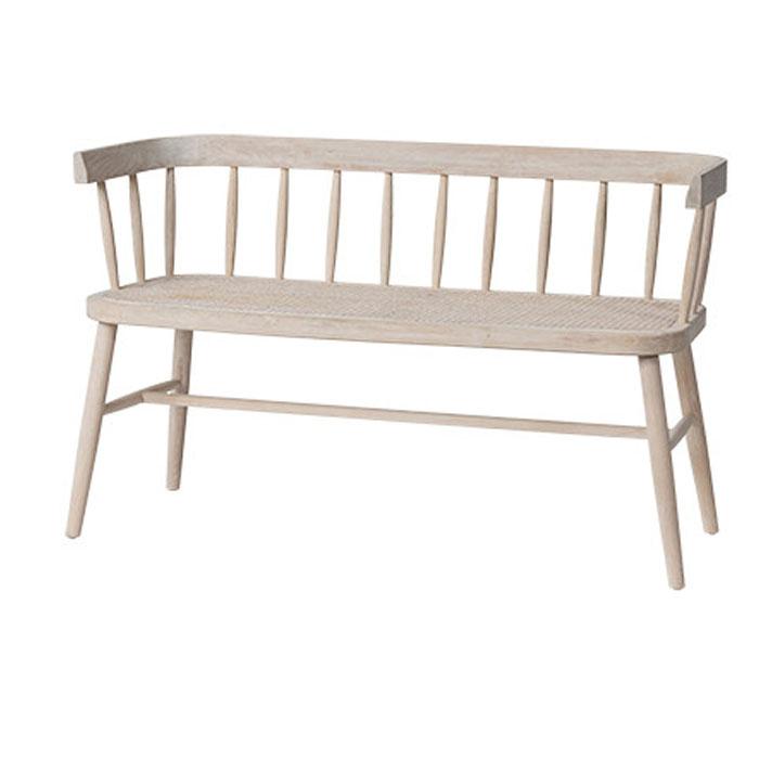 The Shelby Bench in Natural is expertly crafted from natural timber with a whitewash finish, combining classic design and durability. The woven rattan seat and Shaker-style spindled backrest provide both comfort and style. With its solid frame, this bench guarantees stability and adds charm to any setting.