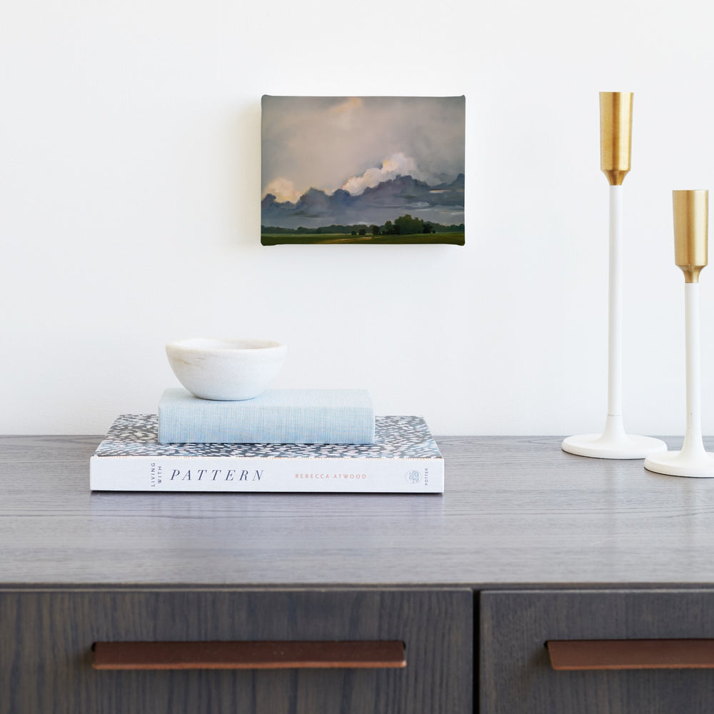 Experience the power of nature with "Travelling Light". Originally created with oil on canvas, this print depicts a resplendent sky, lush green trees, and deep shadows. Its intense colors and stormy horizon instill a sense of adventure, inviting you further to the light.