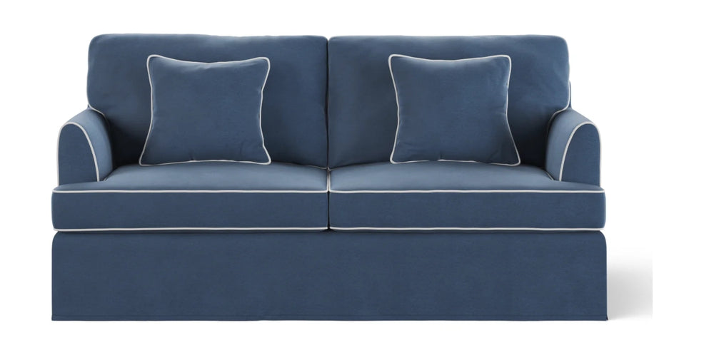 Introducing the Burleigh Sofa, the perfect combination of comfort and style. With a slip cover design and elegant navy with white piping, this sofa adds a touch of sophistication to any living space.