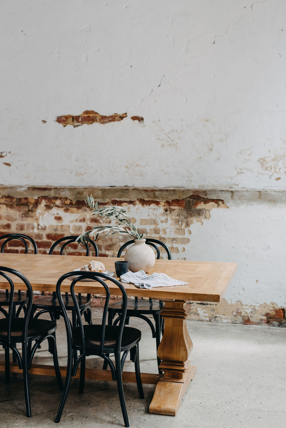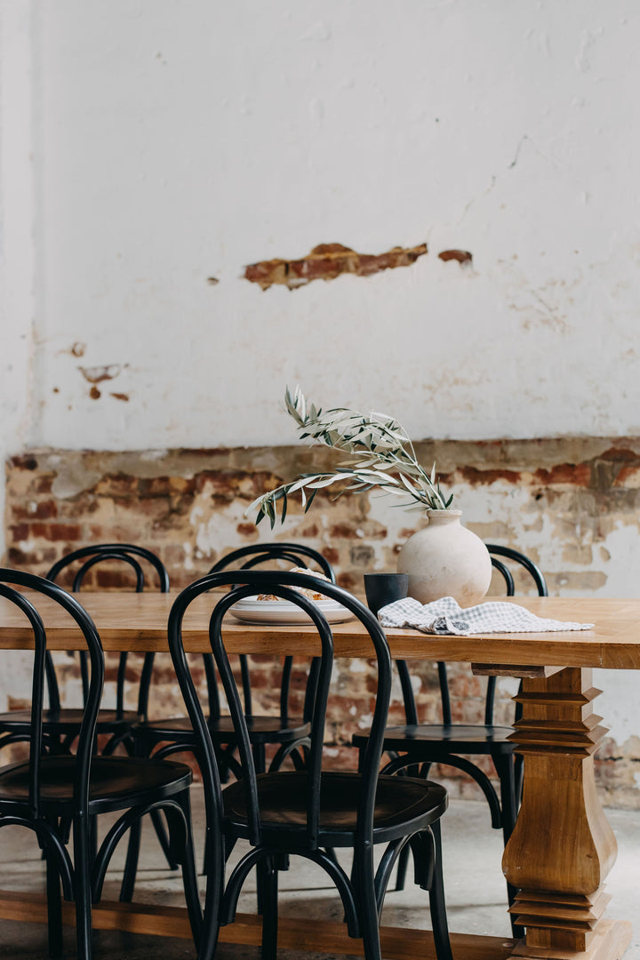 Elevate your dining space with our Manor Dining Room Set. This collection features a classic pedestal leg dining table paired with our Bentwood replica Dining Chair in striking black. Create an elegant and inviting everyday dining experience.