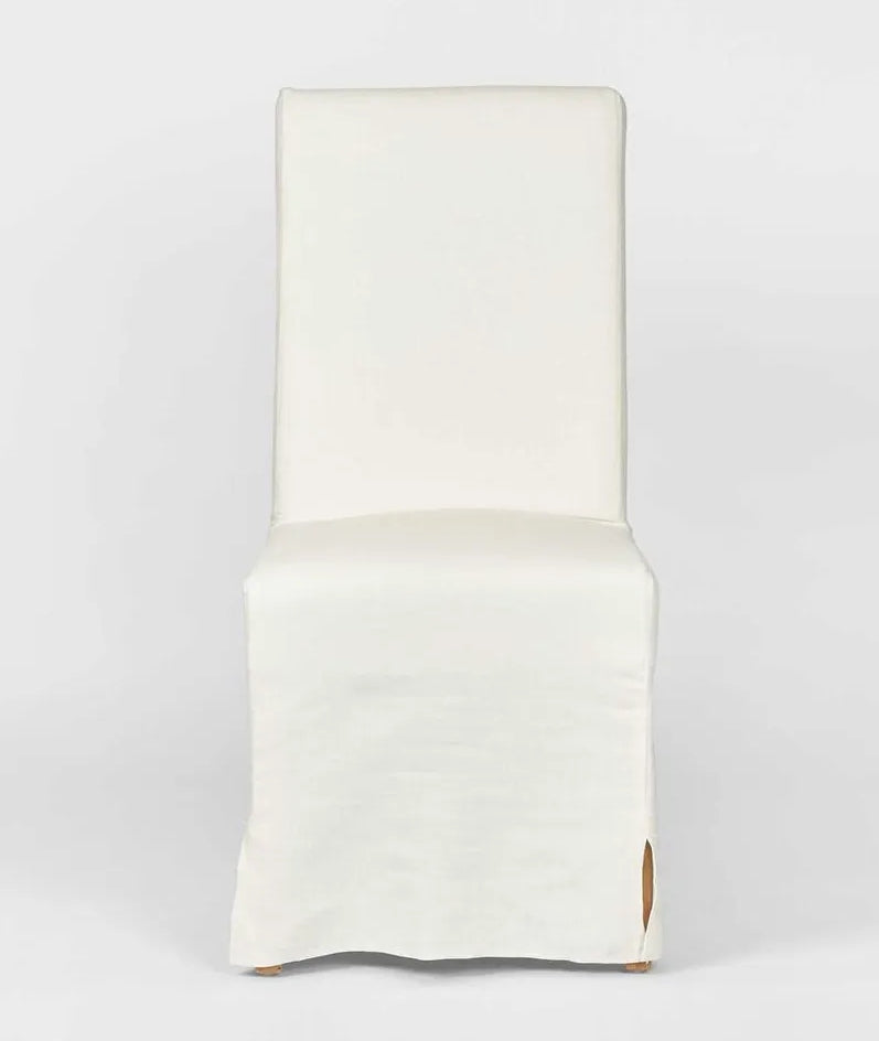 This elegant dining chair features a slip-cover linen blend fabric, giving the classic style a sophisticated, timeless look.