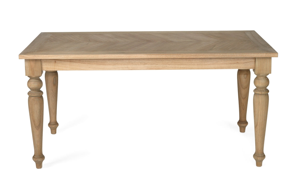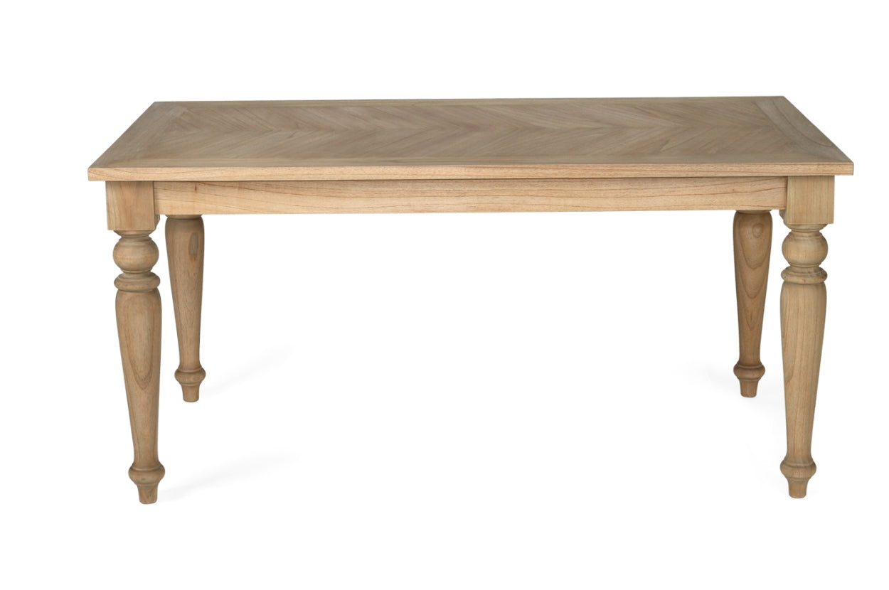 Elevate your dining experience with our English Farmhouse Dining Table. The elegant herringbone pattern and turned legs add a touch of country charm, creating a warm and inviting atmosphere. Available in multiple sizes, it's the perfect centerpiece for any dining area. Bring home the perfect blend of beauty and functionality today.