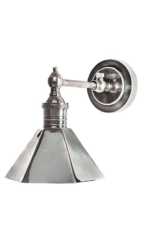 Our Lawley Sconce is the perfect addition to any space. Its stylish and eye-catching hexagon shade made from solid brass and finished with an antiqued silver finish. Versatile in style, from Hamptons to modern homes. This sconce features a unique industrial style that adds character and sophistication.