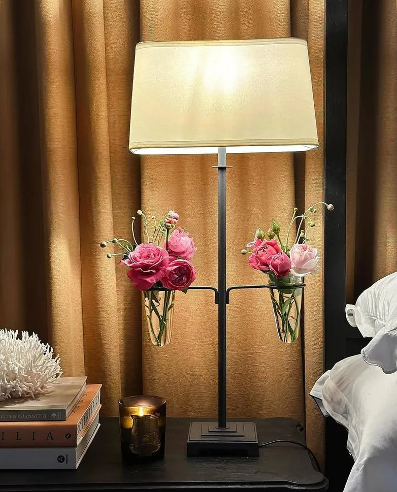 A unique blend of function and artistry, this wrought iron lamp doubles as a striking display piece. Its slim, sculptural frame features built-in glass vases—perfect for adding a touch of greenery or fresh flowers to your space. The soft lighting paired with natural elements brings warmth and personality to consoles, sideboards, or entryways. A conversation piece that brings light and life into any room.